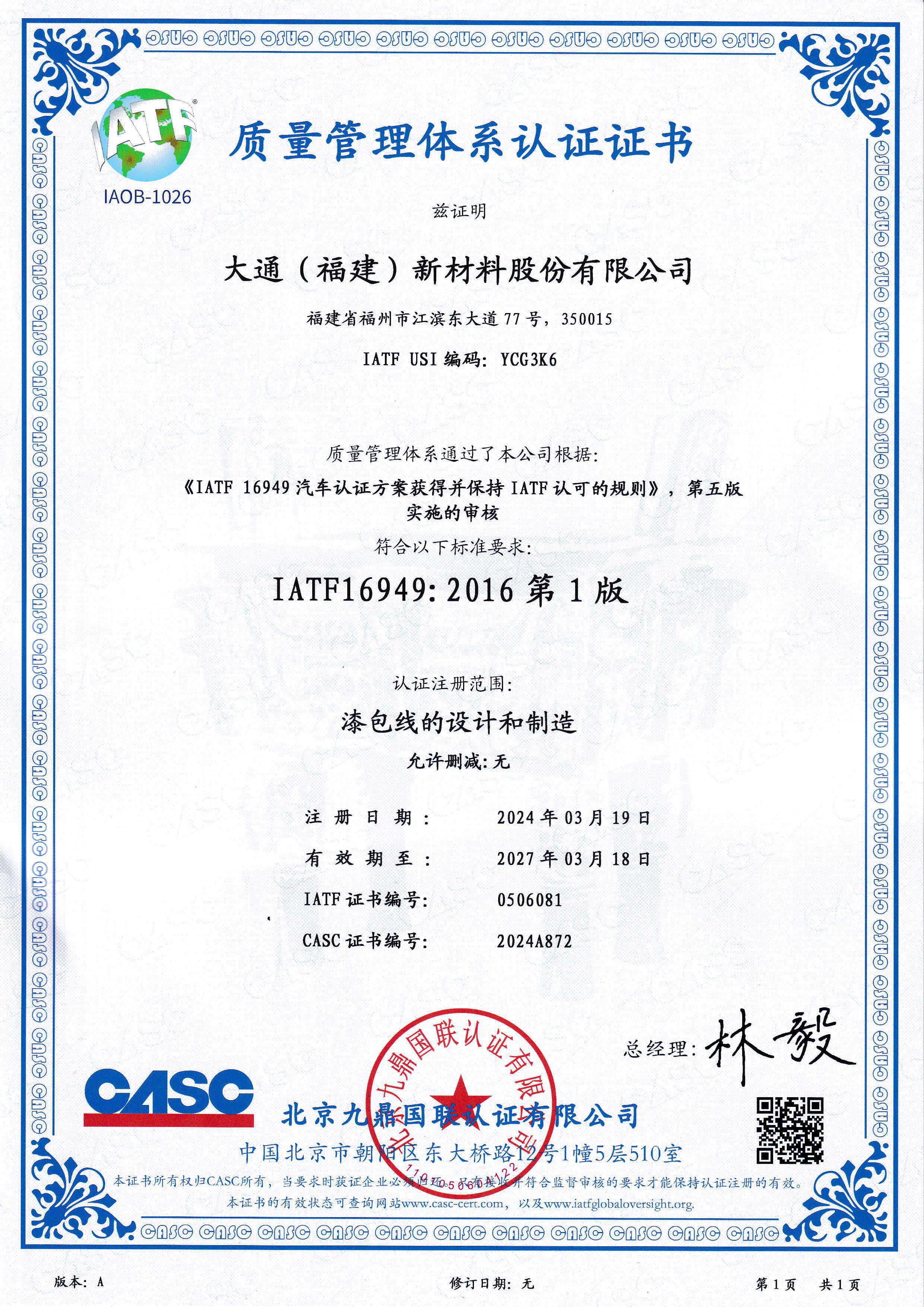 質量管理體系認證證書IATF16949:2016