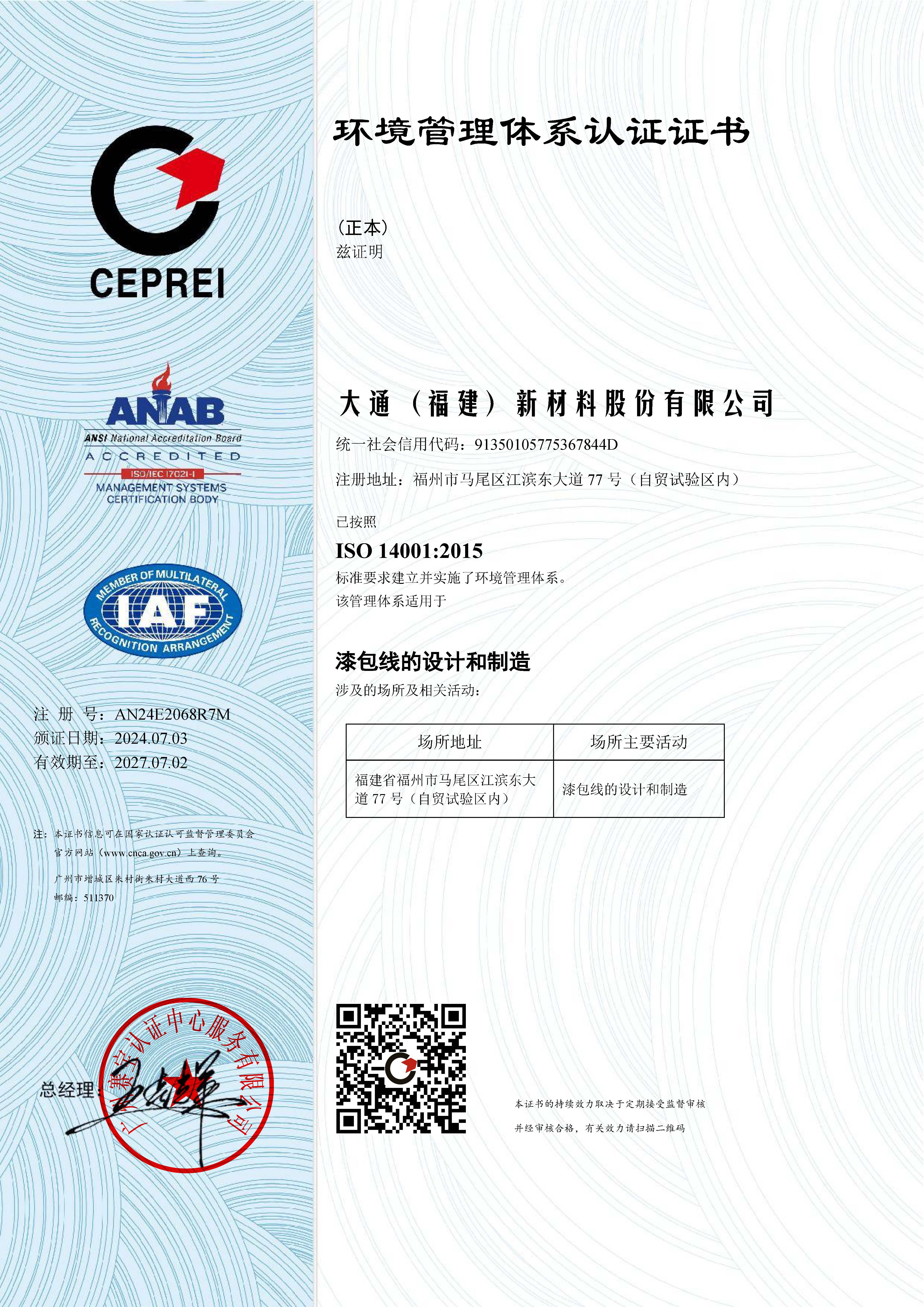 環境管理體系認證證書ISO 14001:2015