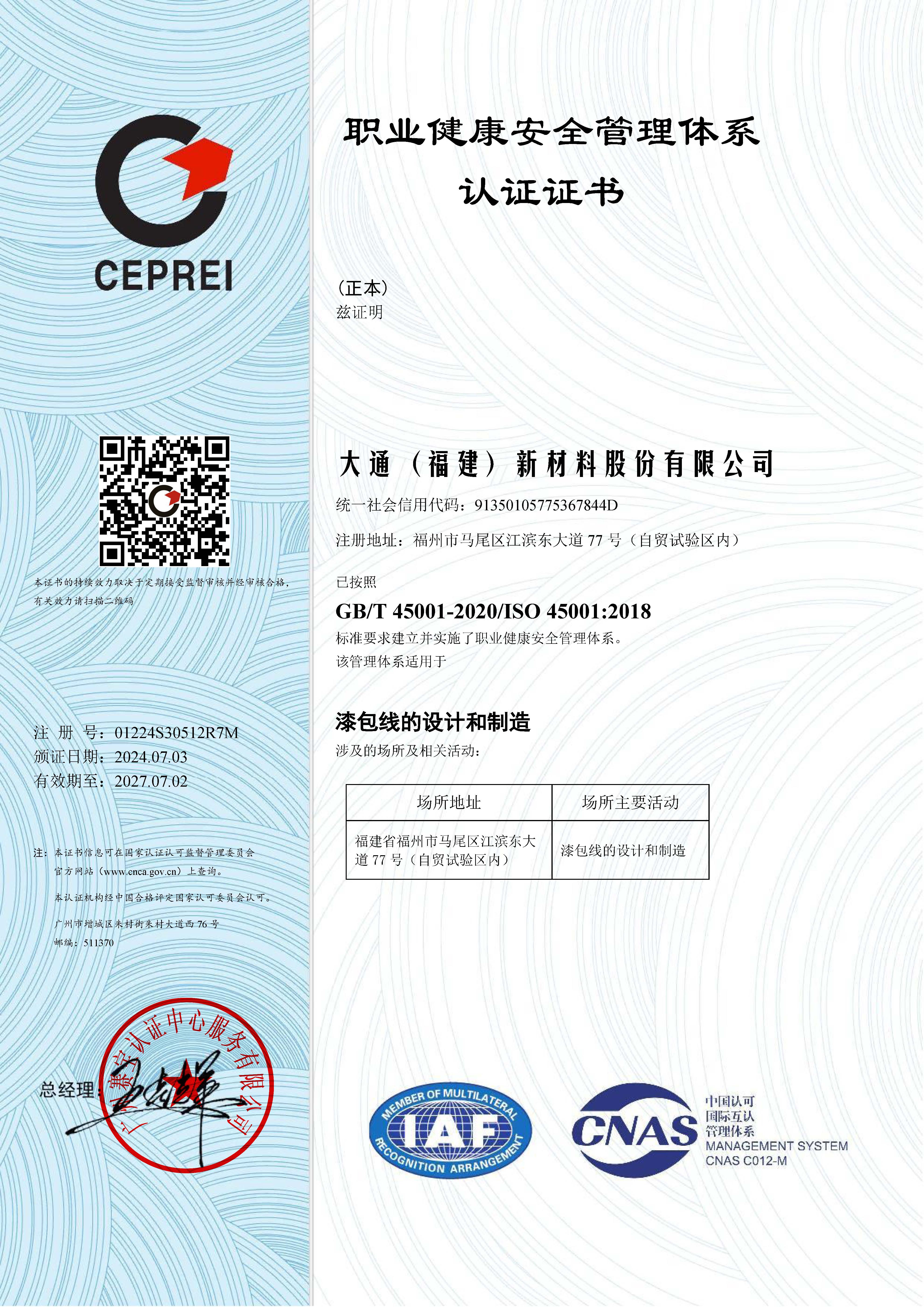 職業健康安全管理體系認證證書GB/T 45001-2020/ISO 45001:2008