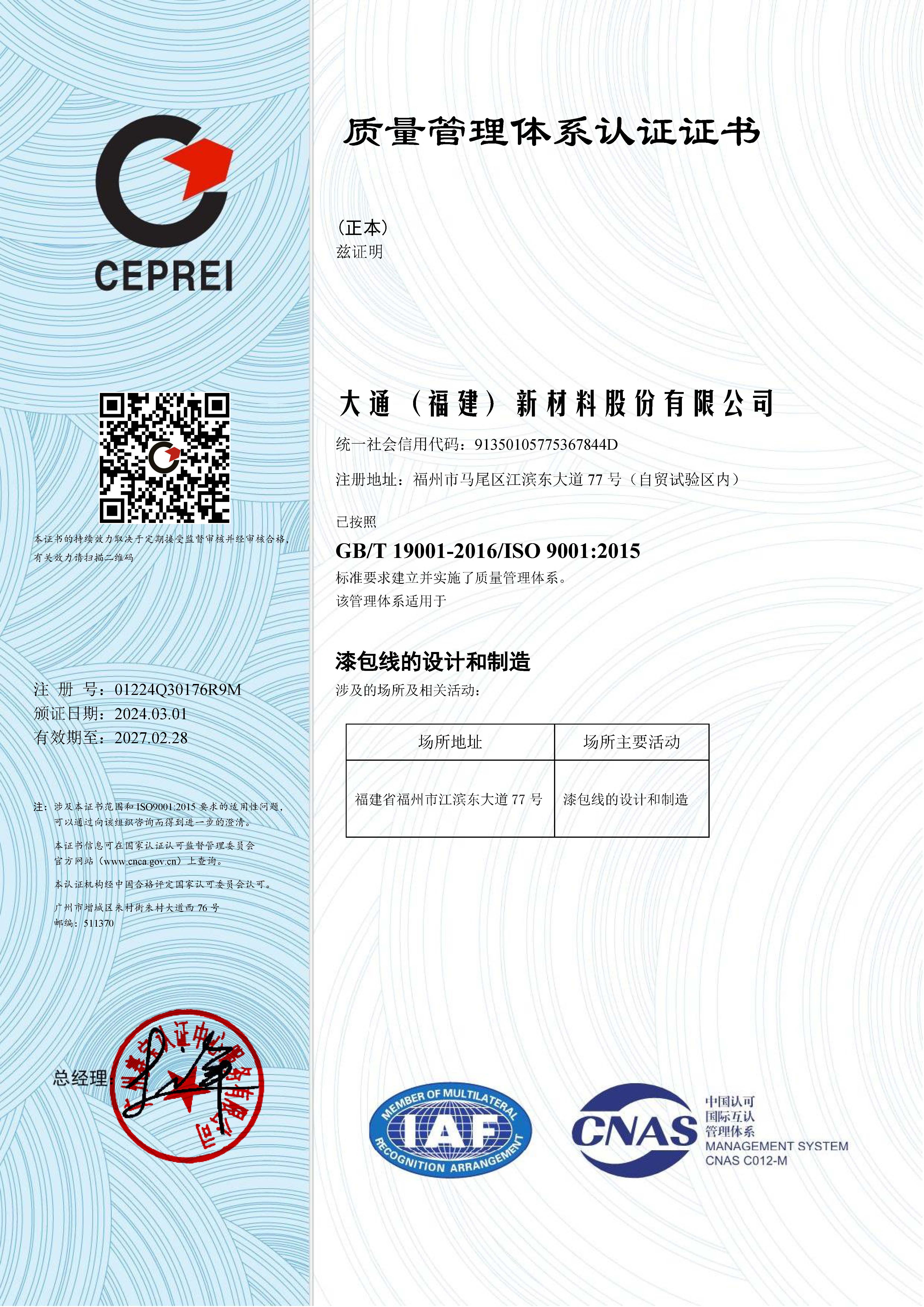 質量管理體系認證證書GB/T 19001-2016/ISO 9001:2015
