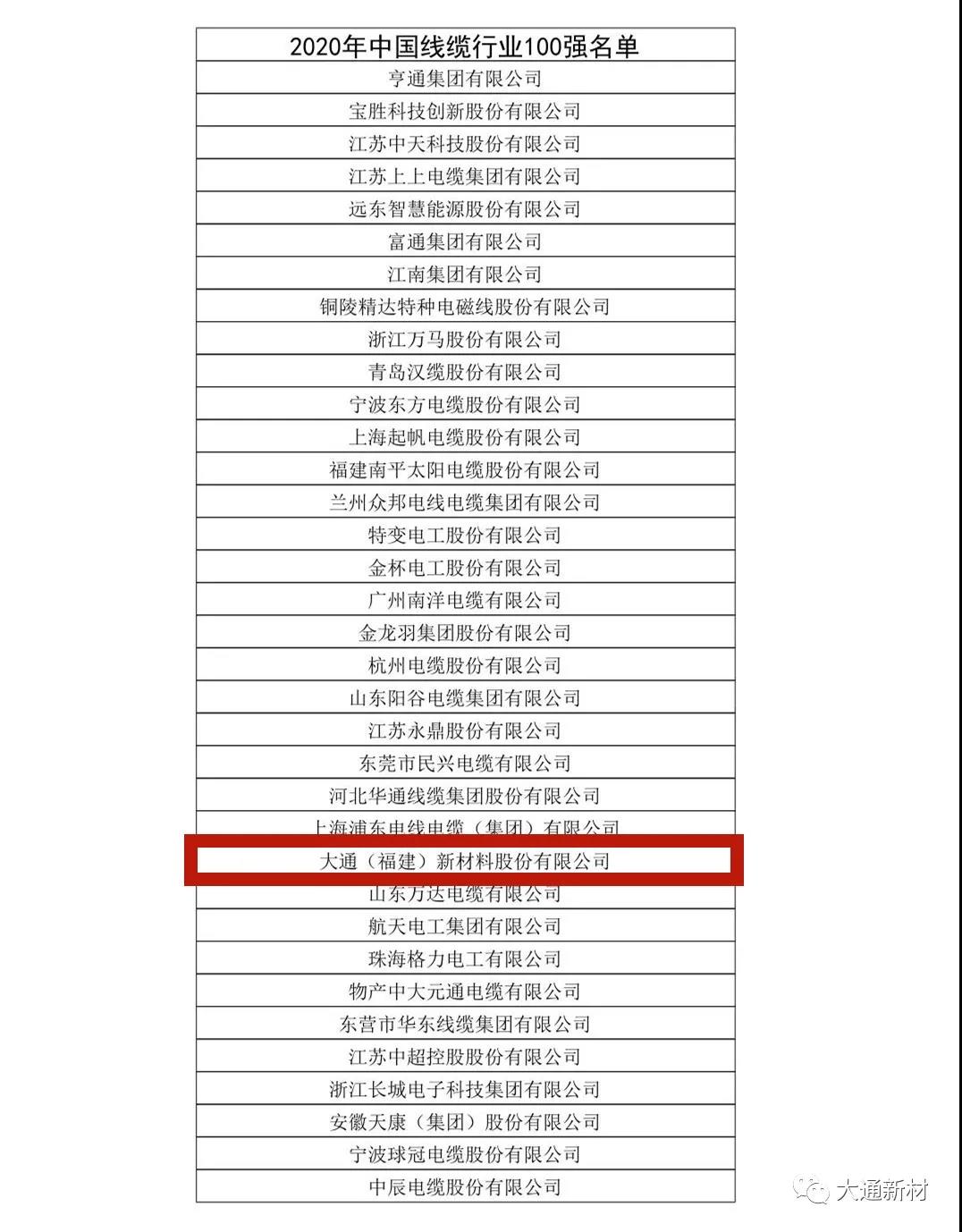 一年一度的2020年中國電線電纜行業大會權威發布了“2020年中國線纜行業最具競爭力企業100強”榜單,大通新材榜上有名,不負眾望。