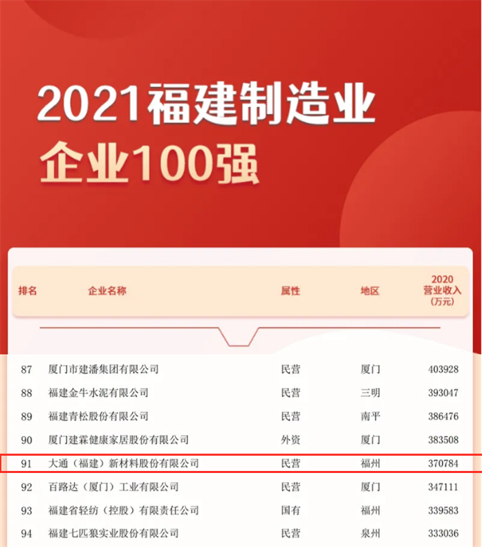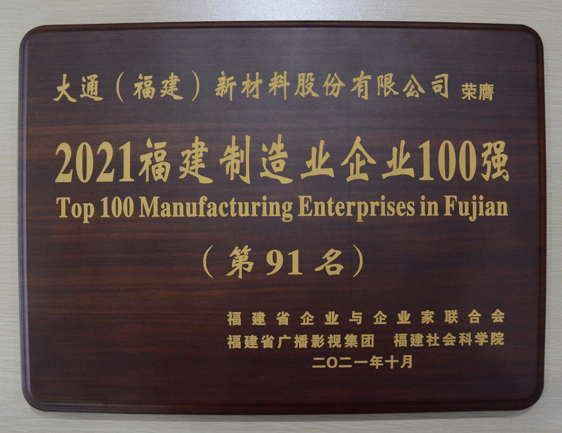 11月3日,在2021福建企業100強發布大會上,大通新材入選“福建制造業企業100強”榜單。