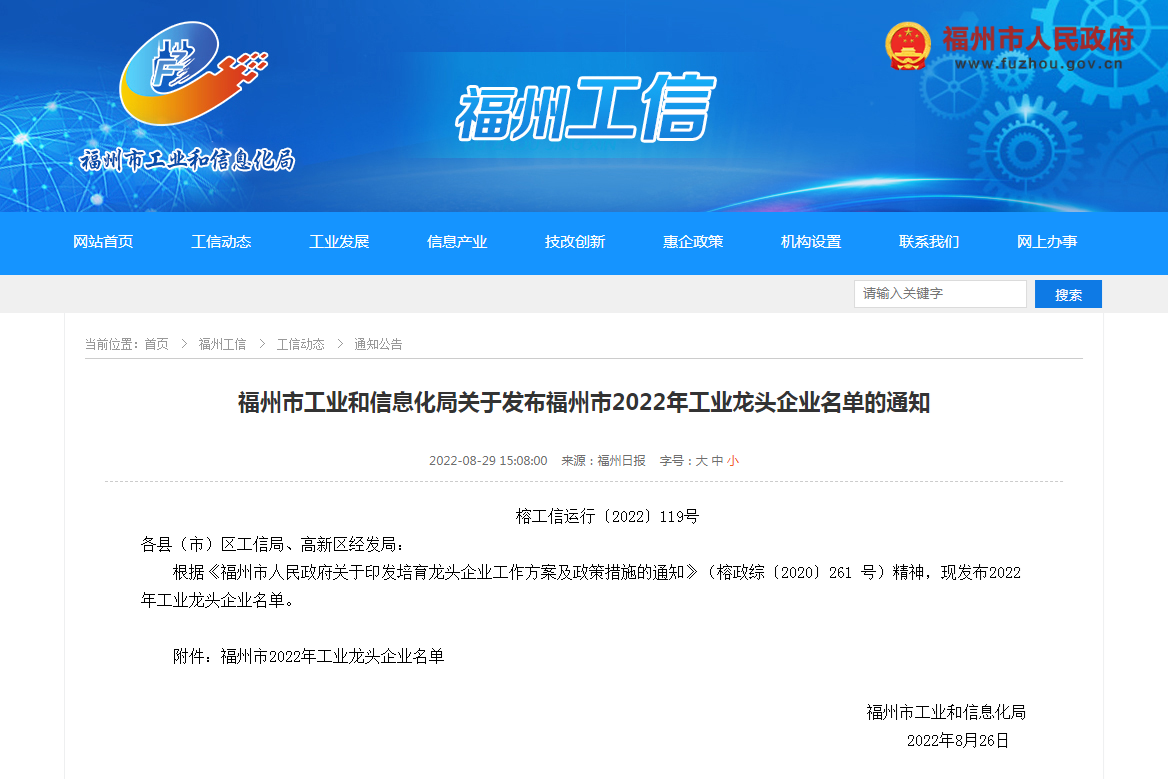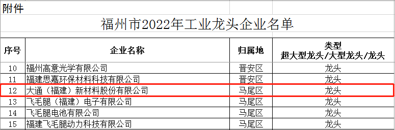 近日,福州市工業和信息化局公布了2022年福州市工業龍頭企業名單,大通新材連續兩年獲評福州市工業龍頭企業。