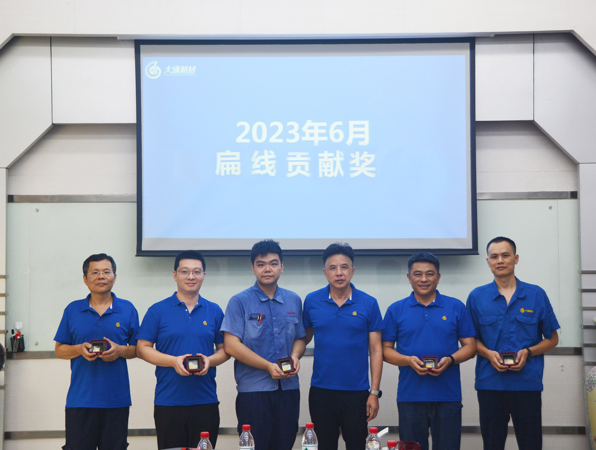 上半年,在世界經濟增長動能不足、行業內卷升級的背景下,大通新材依然實現了產銷兩旺的良好態勢,扁線產銷量再創歷史新高,這一成績來之不易。為激勵全體員工堅定目標,不斷奮進,8月7日,在公司例會上,總經理陳曦對上半年助力扁線產銷量增長作出卓越貢獻的5位員工進行表彰,并為他們頒發特制20g純金金幣以茲鼓勵。