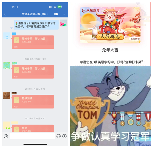 為了點燃員工們的英語學習熱情,公司可謂是下足了功夫。首當其沖的便是創建了“大通英語學習群”,培訓專員化身群主,公司領導帶頭參與,銷售、研發等各路英雄紛紛加入。每周的英語打卡任務不僅督促大家持續進步,更在輕松愉快的群內氛圍中增進了團隊凝聚力。未能完成學習任務的成員需貢獻一份“樂捐”,而每月堅持學習、英語等級提升的小伙伴們,則有機會收獲豐厚的獎勵。通過這種寓教于樂的方式,讓英語學習變得更加有趣。